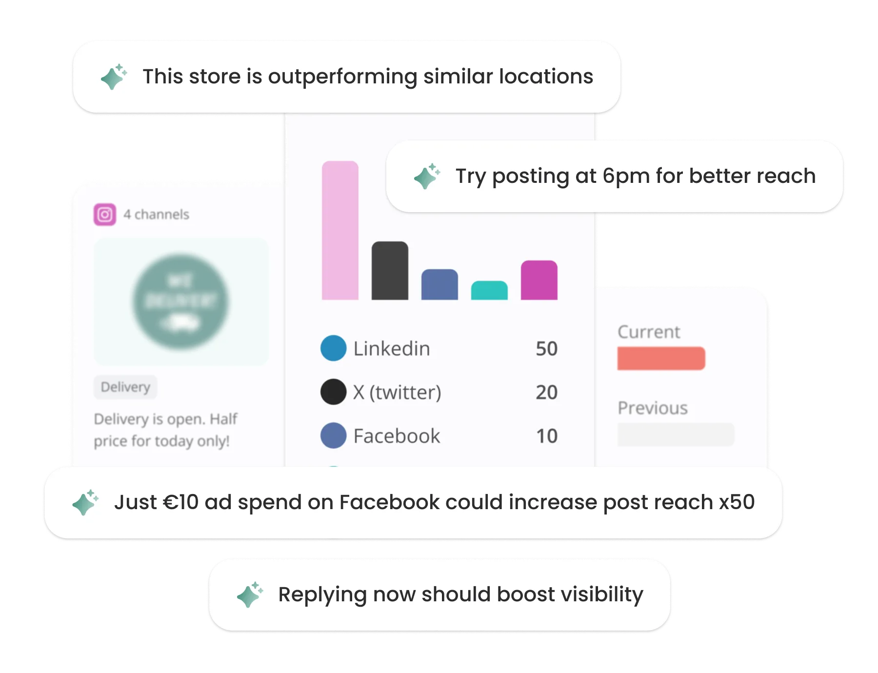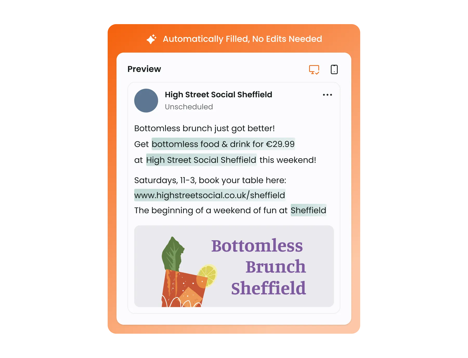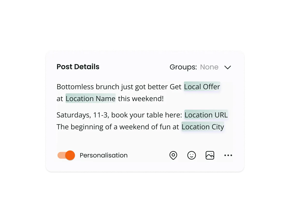 Automatically tailor post copy, images, and offers for each location using smart placeholders.