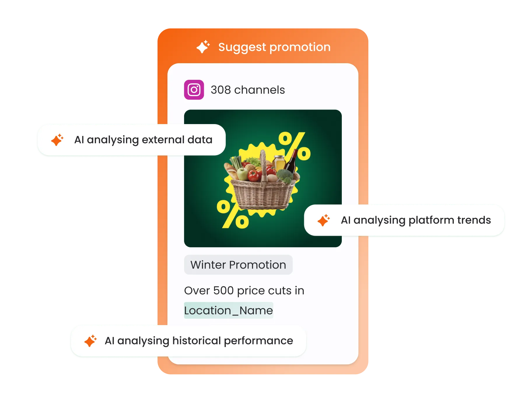 AI analyses historical performance, local trends, and external data (like events or weather) to suggest optimised content or offers.